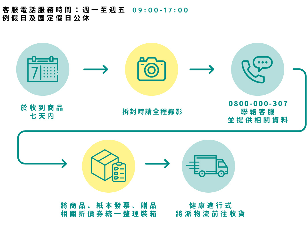 如遇商品缺件或有退貨需求,請於收到商品7天內聯絡客服人員,並提供「姓名」、「訂單編號」、「連絡電話」、「退貨商品名稱」、「退貨原因」、「照片和拆封影片檔」等資料,客服人員收到後將會協助您辦理後續事宜。