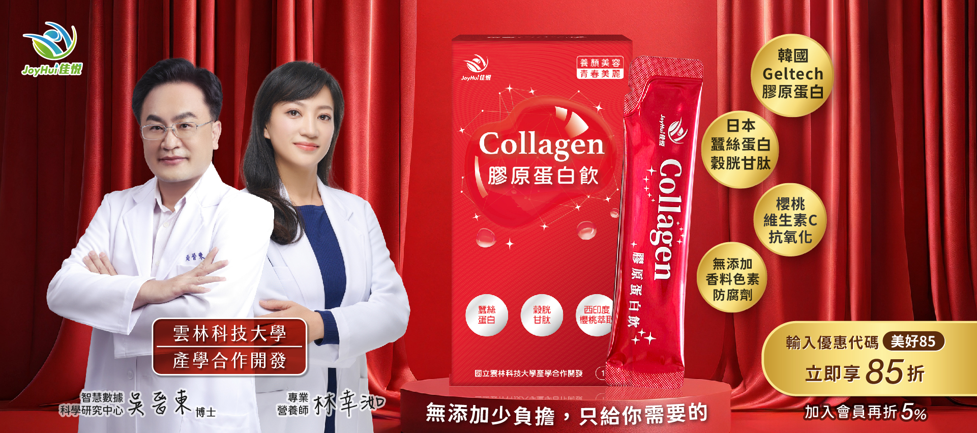營養師與雲科大博士聯合推出「日韓配方膠原蛋白飲」,每包添加5大日韓成分,韓國Geltech膠原蛋白、日本穀胱甘肽、蠶絲蛋白、櫻桃維生素C,每日一包養顏美容,無添加蔗糖果糖、防腐劑,好喝無膠原異味!