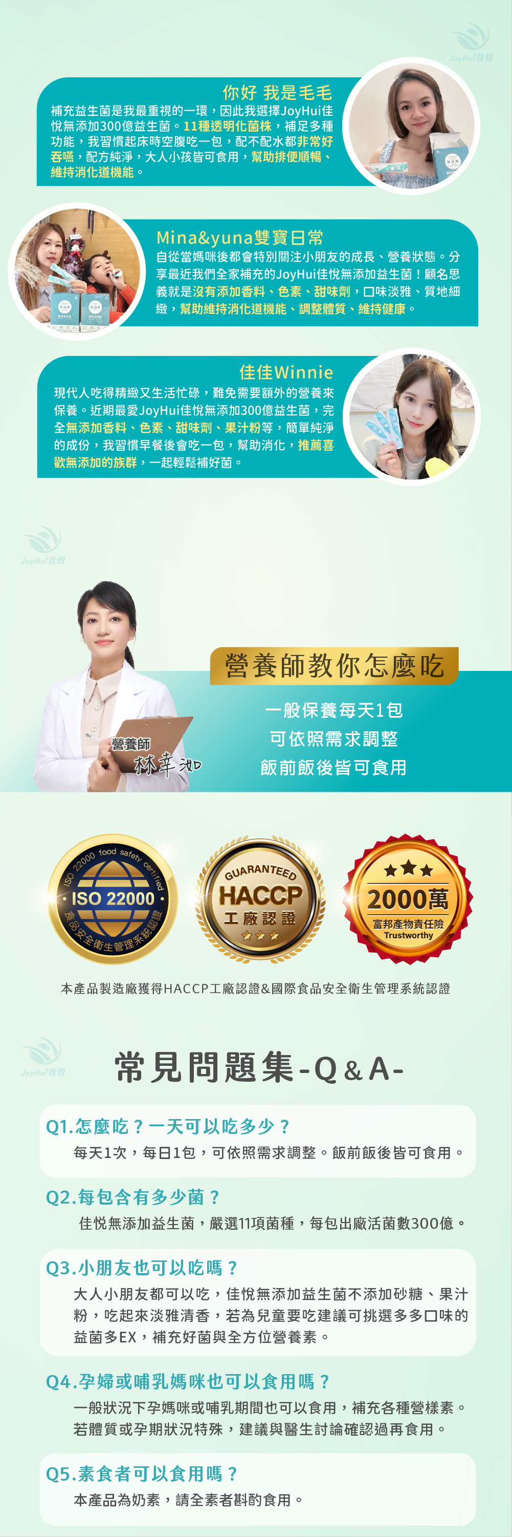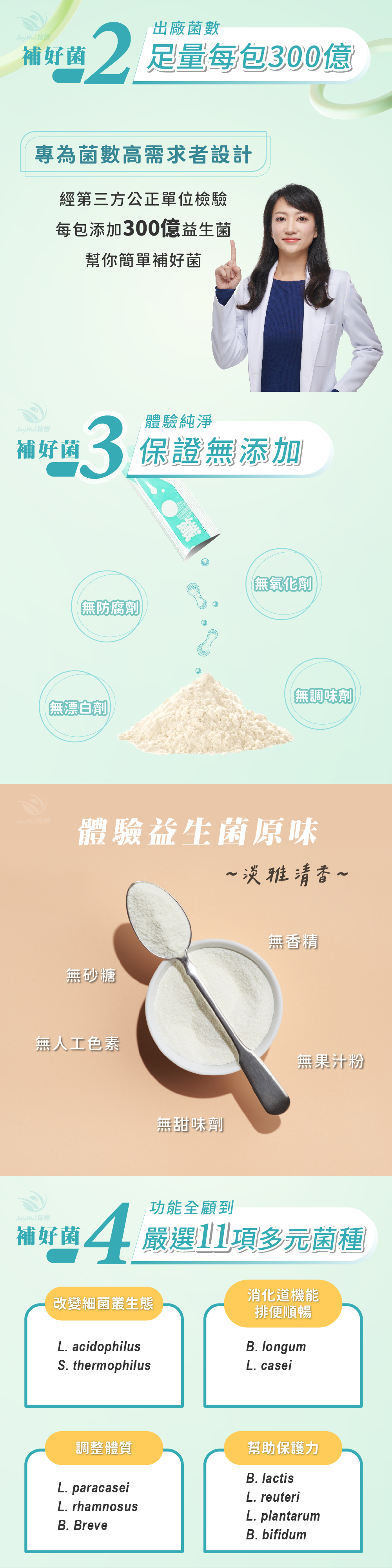 根據每人體質不同需求,佳悅無添加益生菌出廠菌數每包300億好菌,且經第三方檢驗,每天1包簡單補充好菌。