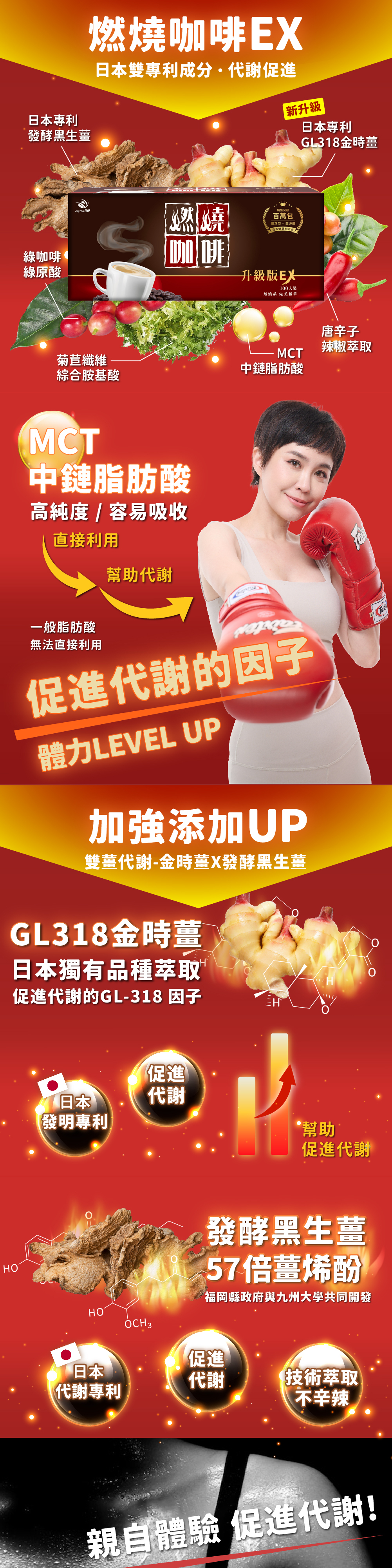 新升級日本發明專利GL318金時薑,與日本代謝專利發酵黑生薑搭配,代謝成分更升級!