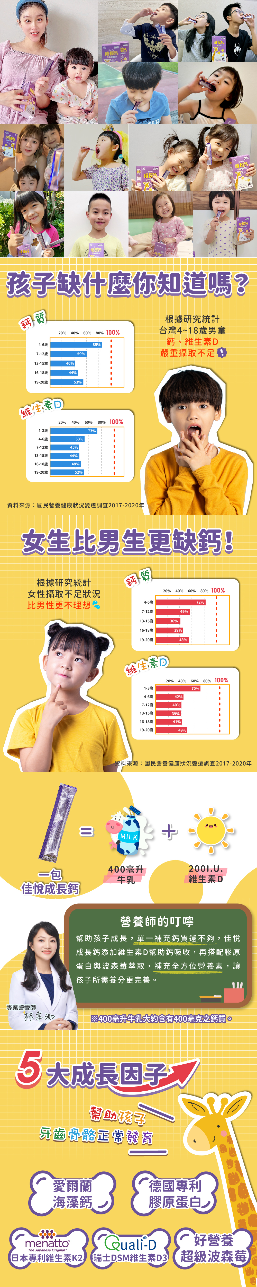 愛爾蘭海藻鈣、德國膠原蛋白、瑞士DSM維生素D3、日本menatto維生素K2、超級波森莓,補充全方位營養素,孩子所需養分更完善!