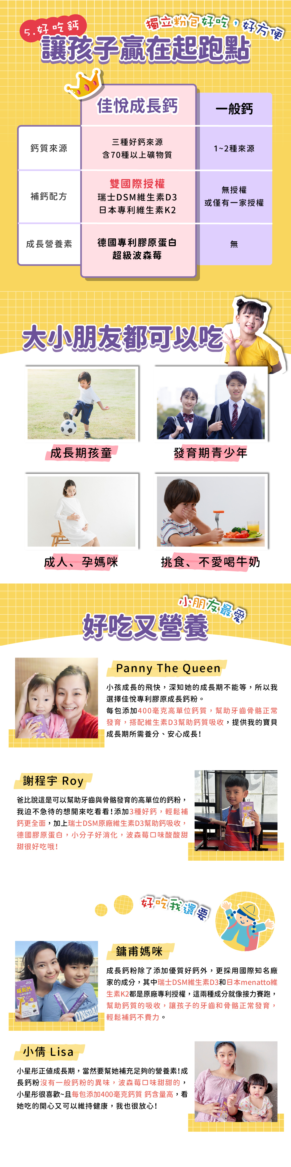 沒有一般鈣粉的異味,莓果風味口感佳小朋友最愛,大人小孩一同輕鬆補充鈣質、膠原蛋白、維生素D3與維生素K2等營養素。