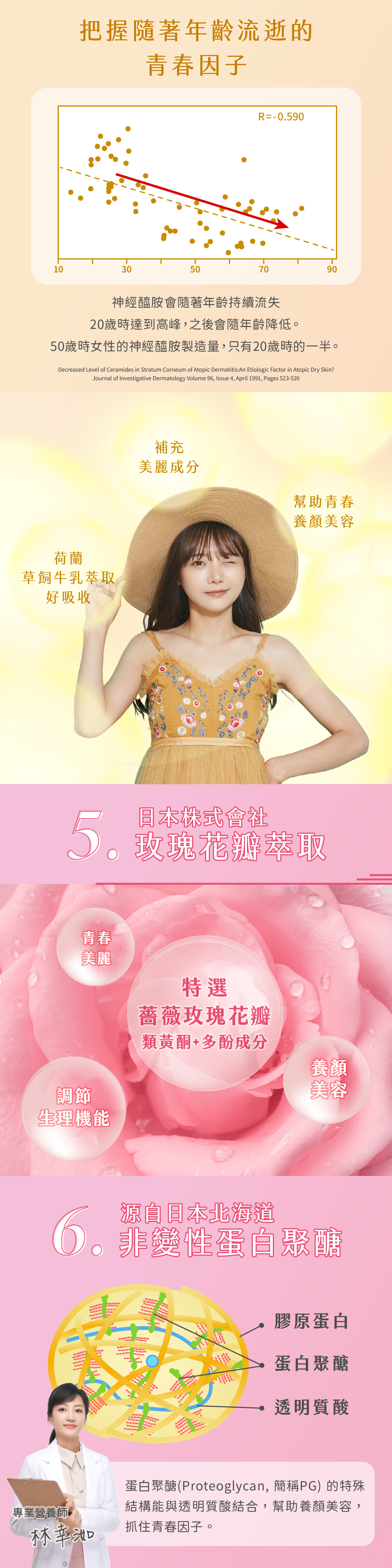 添加源自日本北海道的非變性蛋白聚醣,蛋白聚醣(Proteoglycan, 簡稱PG) 的特殊結構能與透明質酸結合,幫助養顏美麗,抓住青春因子。