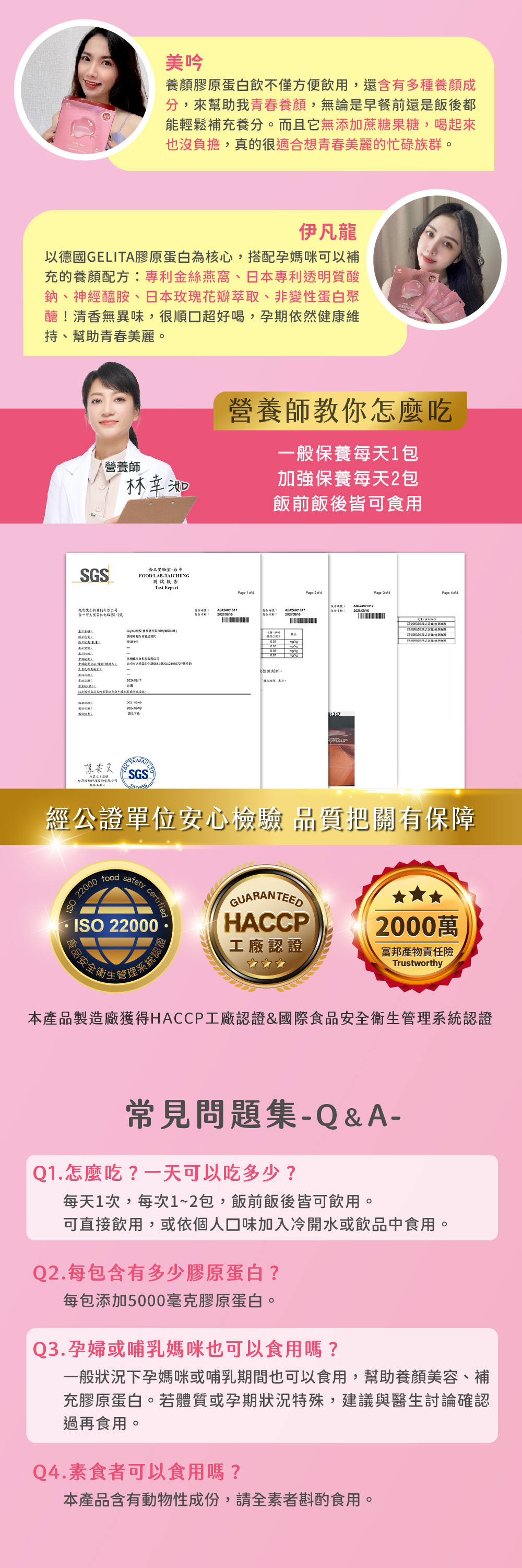 選用國際大廠原料、品質安全安心,加上第三方公正單位檢驗,青春養顏不擔心!