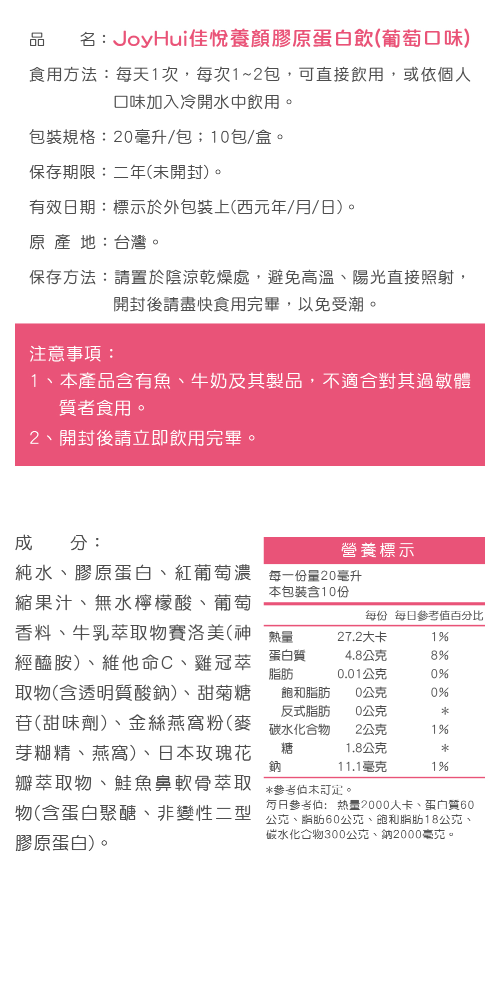 品 名:JoyHui佳悅 養顏膠原蛋白飲(葡萄口味)