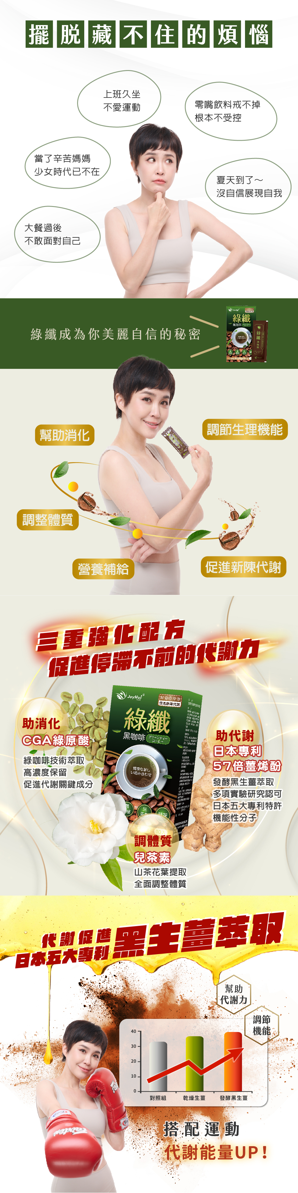 【JoyHui佳悅】的綠纖黑咖啡是擁有美、日、台三大成份專利,並榮獲世界品質評鑑肯定。添加「兒茶素+綠原酸+日本專利薑烯酚」窈窕關鍵配方,是比綠茶咖啡再進化的強化型綠茶咖啡,一天一杯促進代謝、調整體質。