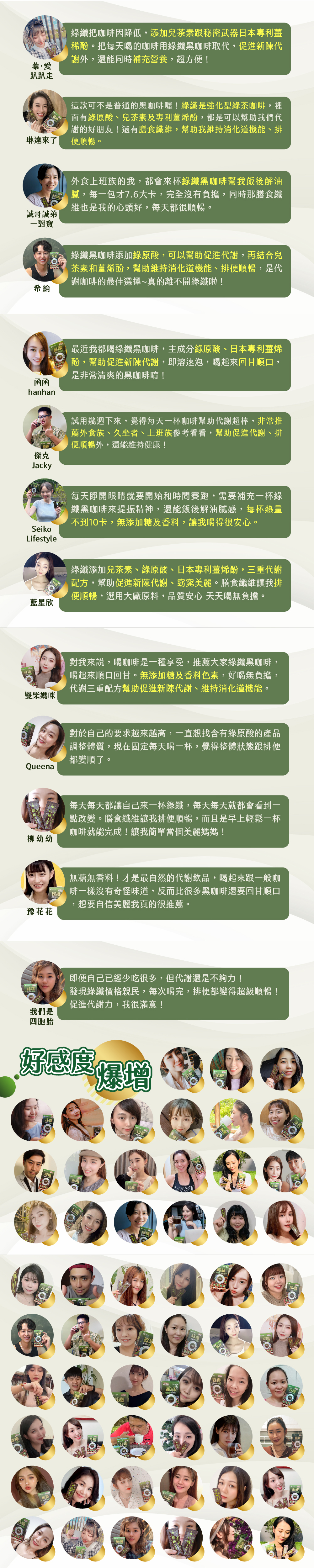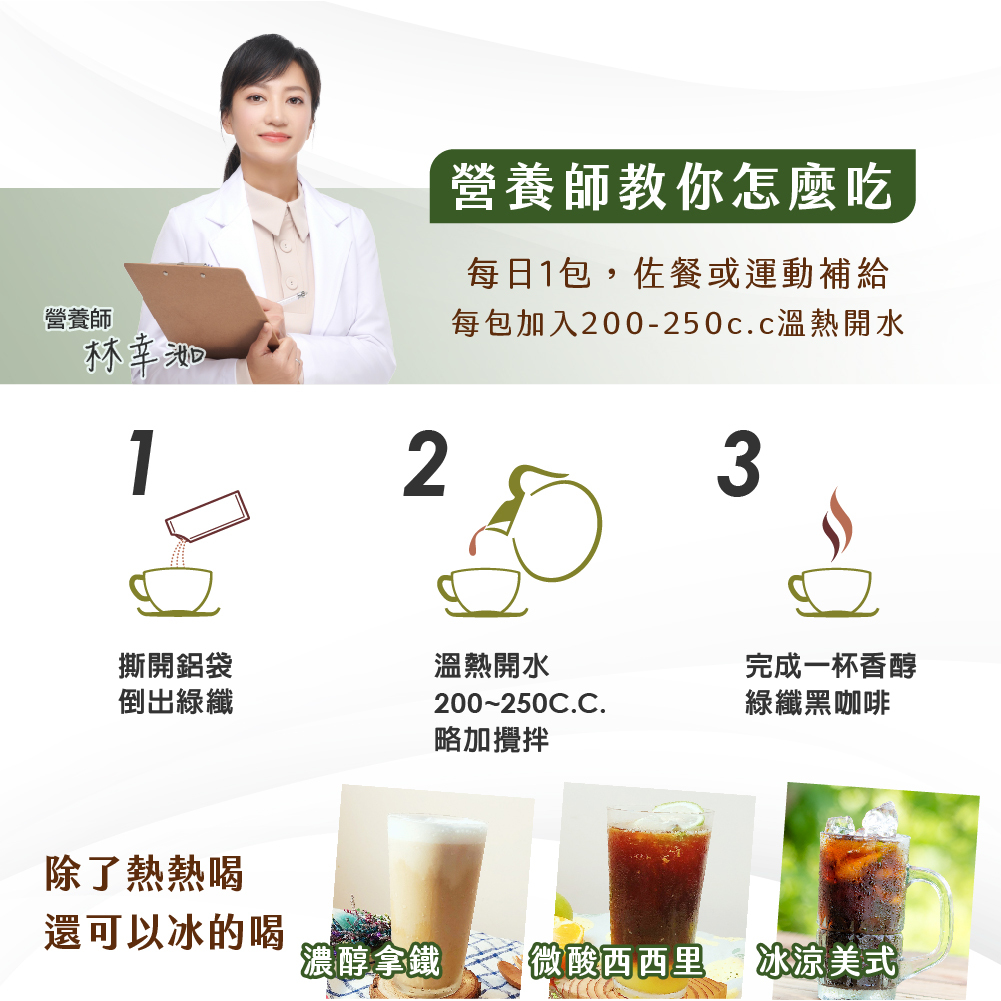 常喝咖啡,每日攝取之咖啡因容易暴增,綠纖從茶花中萃取兒茶素和綠咖啡豆萃取綠原酸,讓綠纖當中的咖啡因每包僅63毫克,而且熱量不到10大卡。無添加糖或香料,攜帶方便,口感順口、回甘不苦澀,也是防彈咖啡的好夥伴。