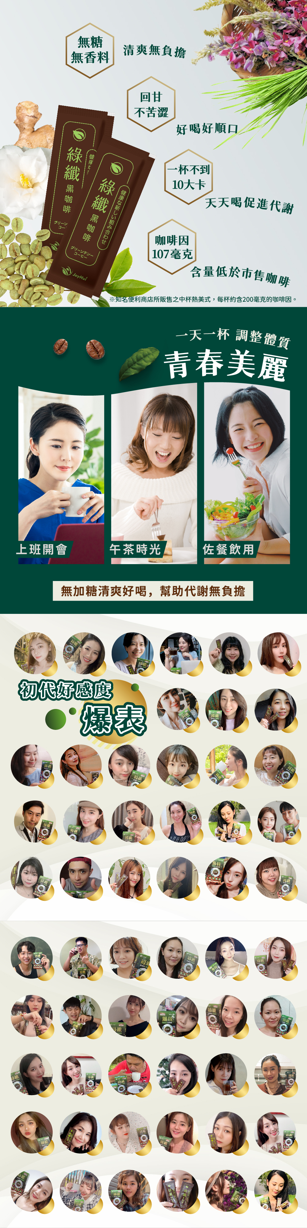 全新升級「綠纖EX」添加「日本小麥若葉+日本葛花萃取物」幫助排便順暢、窈窕,搭配兒茶素+綠原酸+日本專利薑烯酚關鍵配方,打造五重強化成分,促進代謝再突破!是比綠茶咖啡再進化的強化型綠茶咖啡,一天一杯促進代謝、調整體質。