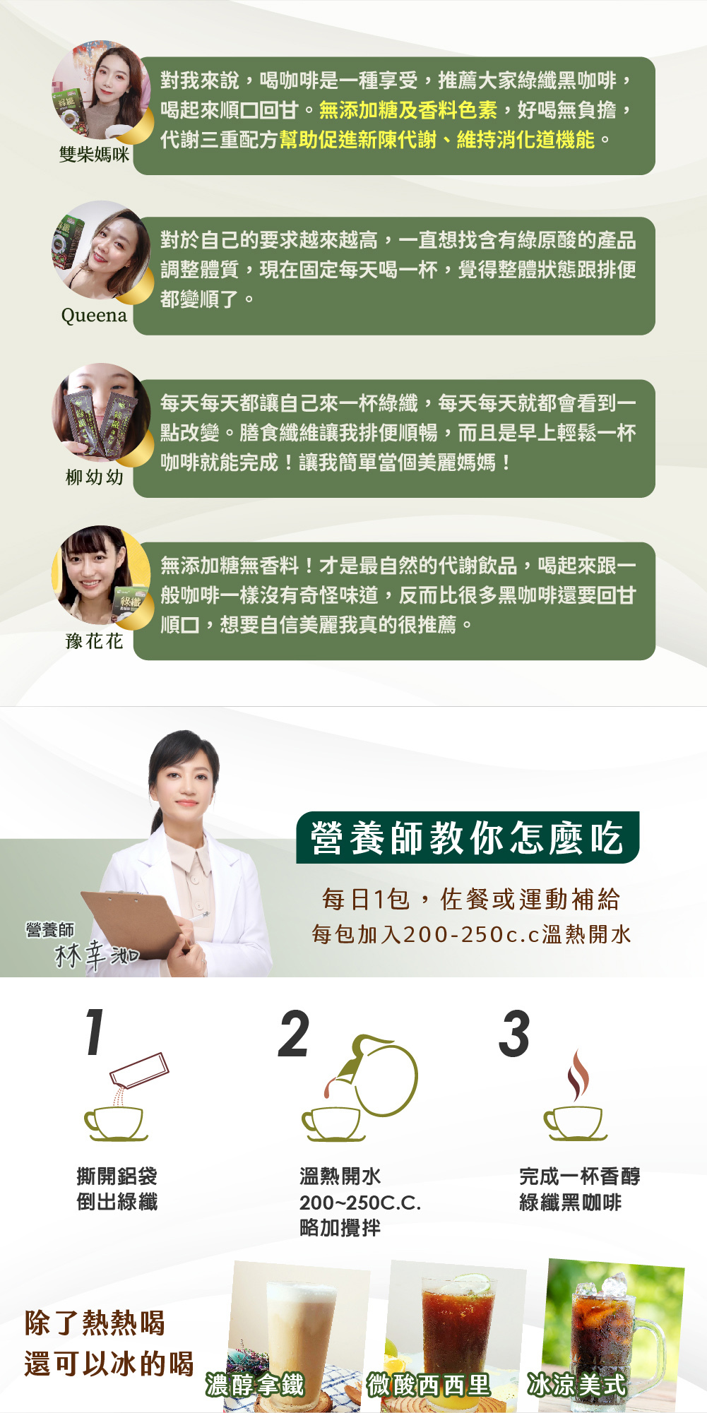 成 分:咖啡粉、玉米來源水溶性纖維、菊糖(菊苣纖維)、綠茶萃取物(含兒茶素)、綠咖啡萃取(含綠原酸)、日本專利發酵黑生薑、大麥芽萃取物、馬鈴薯萃取物、山葛萃取物(麥芽糊精、山葛萃取物)、小麥若葉、植物性濃縮蛋白(米蛋白)。