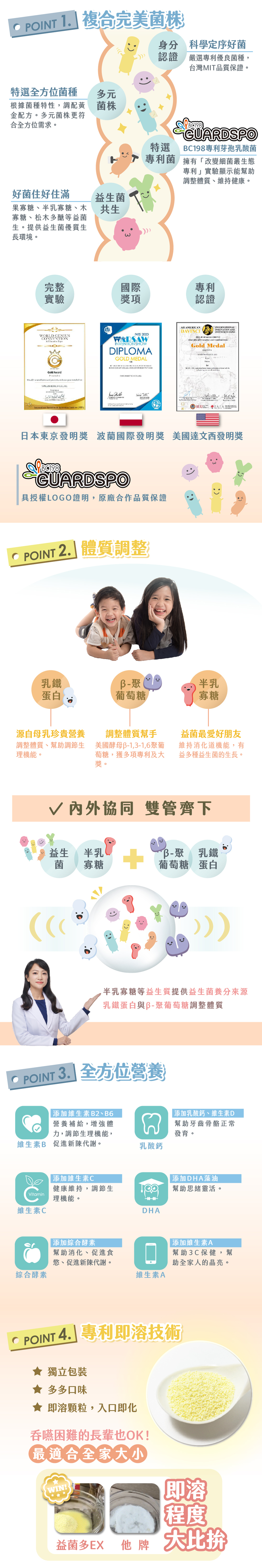嚴選優質專利複合益生菌+專利BC198芽孢乳酸菌,與基礎營養維生素B2、B6和維生素C,搭配β-聚葡萄糖和乳鐵蛋白體質調整配方,多多口味好吃,大人小孩都喜歡,即溶顆粒兒童長輩都好吞嚥,隨身包方便攜帶補充,添加DHA藻油、維生素A,營養更全方位。