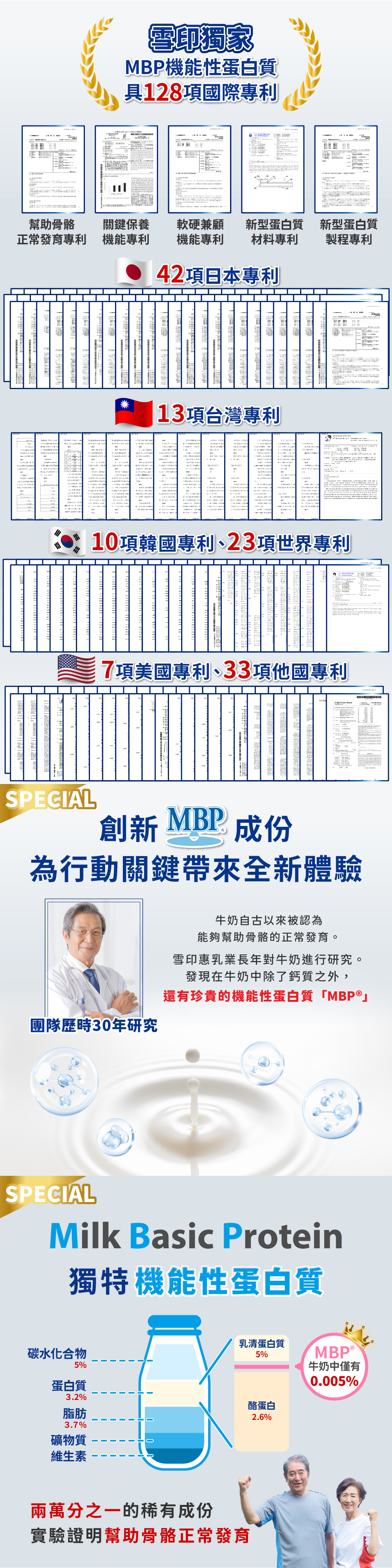 雪印是日本知名的乳業品牌,已長達百年的歷史,根據雪印長年研究結果,發現牛奶含有微量的機能性蛋白質—取「Milk Basic Protein」的頭英文字命名為「MBP®」,是雪印惠乳業獨家成分,在200毫升的牛奶中僅有0.005%,具有24篇文獻研究、128項專利,經實驗證明可以幫助骨骼正常發育,從孩童至熟齡族長輩皆適合補充。