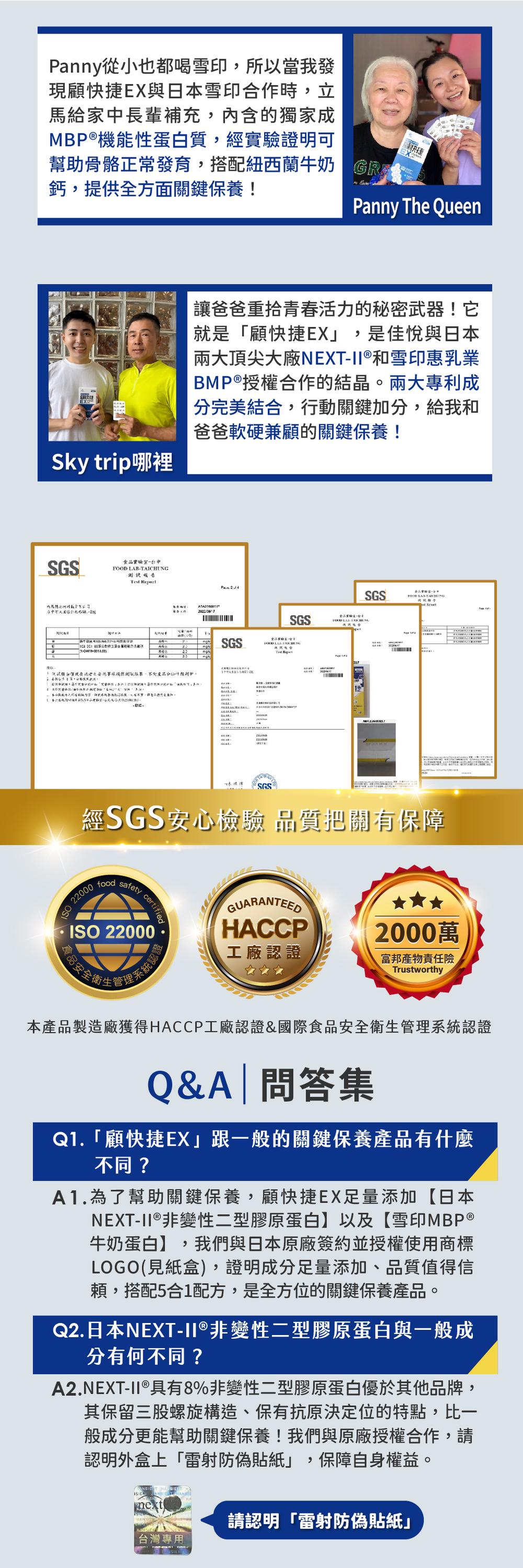 顧快捷EX具有日本雙專利授權成分+5合1關鍵保養配方,幫助關鍵靈活、讓你輕鬆生活!