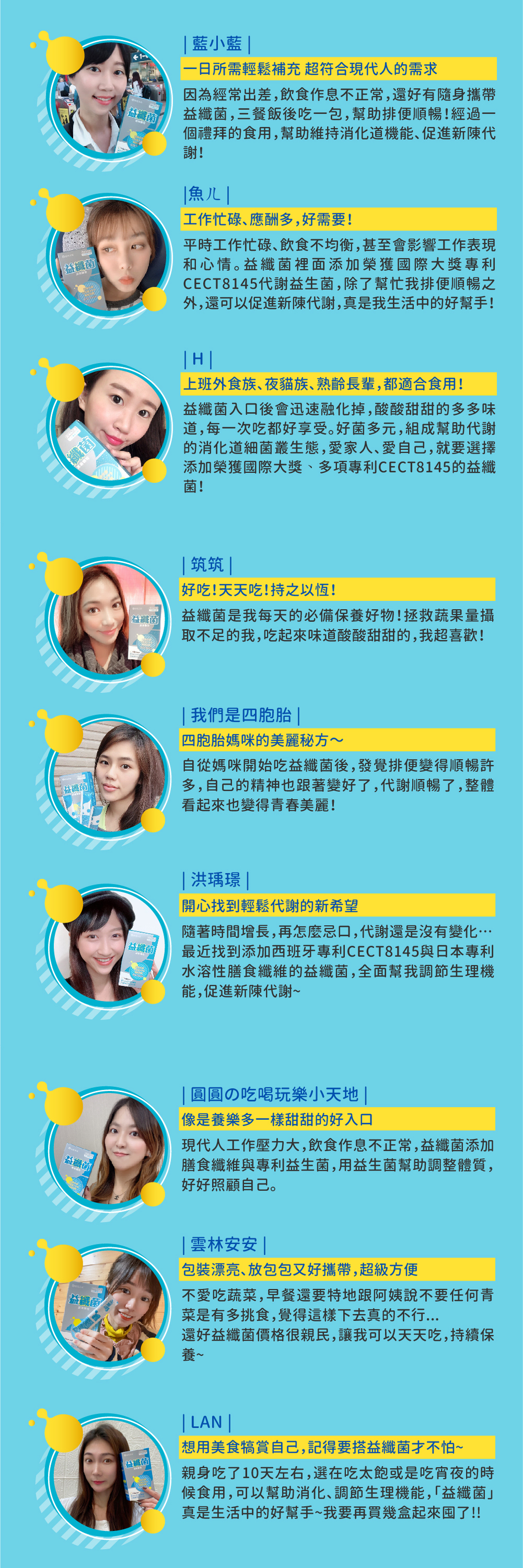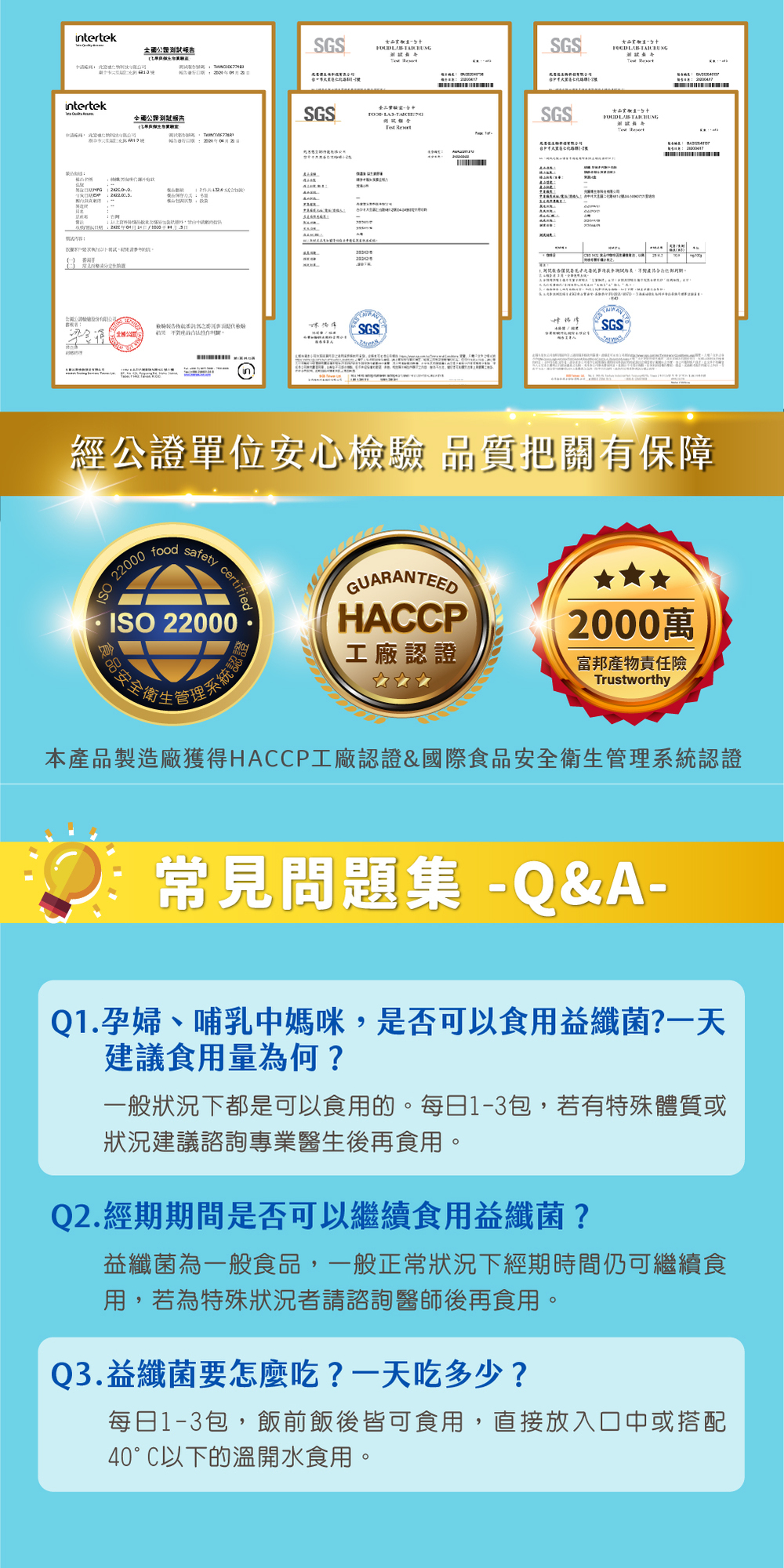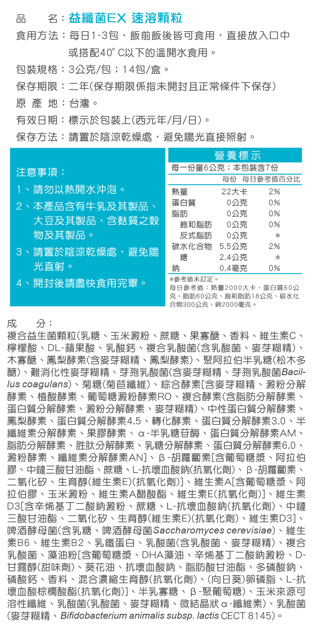 成 分:複合益生菌顆粒(乳糖、玉米澱粉、蔗糖、果寡醣、香料(含酒精、水、香料、醋酸、焦糖色素、脂肪酸甘油酯、丙二醇、甘油、辛烯基丁二酸鈉澱粉、偏磷酸鈉、多磷酸鈉、焦磷酸鈉)、維生素C、檸檬酸、DL-蘋果酸、乳酸鈣、複合乳酸菌(含乳酸菌、麥芽糊精)、木寡醣、鳳梨酵素(含麥芽糊精、鳳梨酵素)、聚阿拉伯半乳糖(松木多醣)、難消化性麥芽糊精、芽孢乳酸菌(含麥芽糊精、芽孢乳酸菌Bacillus coagulans)、菊糖(菊苣纖維)、綜合酵素[含麥芽糊精、澱粉分解酵素、植酸酵素、葡萄糖澱粉酵素RO、複合酵素(含脂肪分解酵素、蛋白質分解酵素、澱粉分解酵素、麥芽糊精)、中性蛋白質分解酵素、鳳梨酵素、蛋白質分解酵素4.5、轉化酵素、蛋白質分解酵素3.0、半纖維素分解酵素、果膠酵素、α-半乳糖苷酶、蛋白質分解酵素AM、脂肪分解酵素、胜肽分解酵素、乳糖分解酵素、蛋白質分解酵素6.0、澱粉酵素、纖維素分解酵素AN]、β-胡蘿蔔素[含葡萄糖漿、阿拉伯膠、中鏈三酸甘油酯、蔗糖、L-抗壞血酸鈉(抗氧化劑)、β-胡蘿蔔素、二氧化矽、生育醇(維生素E)(抗氧化劑)]、維生素A[含葡萄糖漿、阿拉伯膠、玉米澱粉、維生素A醋酸酯、維生素E(抗氧化劑)]、維生素D3[含辛烯基丁二酸鈉澱粉、蔗糖、L-抗壞血酸鈉(抗氧化劑)、中鏈三酸甘油酯、二氧化矽、生育醇(維生素E)(抗氧化劑)、維生素D3]、啤酒酵母菌(含乳糖、啤酒酵母菌Saccharomyces cerevisiae)、維生素B6、維生素B2、乳鐵蛋白、乳酸菌(含乳酸菌、麥芽糊精)、複合乳酸菌、藻油粉[含葡萄糖漿、DHA藻油、辛烯基丁二酸鈉澱粉、D-甘露醇(甜味劑)、葵花油、抗壞血酸鈉、脂肪酸甘油酯、多磷酸鈉、磷酸鈣、香料、混合濃縮生育醇(抗氧化劑)、(向日葵)卵磷脂、L-抗壞血酸棕櫚酸酯(抗氧化劑)]、半乳寡糖、β-聚葡萄糖)、玉米來源可溶性纖維、乳酸菌(乳酸菌、麥芽糊精、微結晶狀α-纖維素)、乳酸菌(麥芽糊精、Bifidobacterium animalis subsp. lactis CECT 8145)。