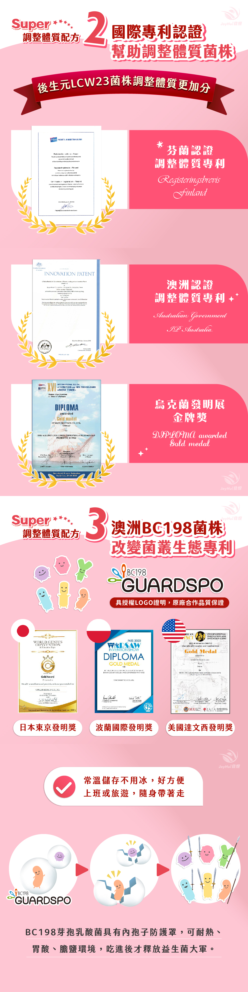 佳悅與國立雲林科技大學博士合作推出,添加國際專利認證好菌-LCW23乳酸菌同時具有後生元特性,實驗顯示可以幫助調整體質,且具有芬蘭、澳洲調整體質專利、烏克蘭發明獎金牌獎,受國際專利與大獎肯定,是幫助全家人維持健康的優質好菌。