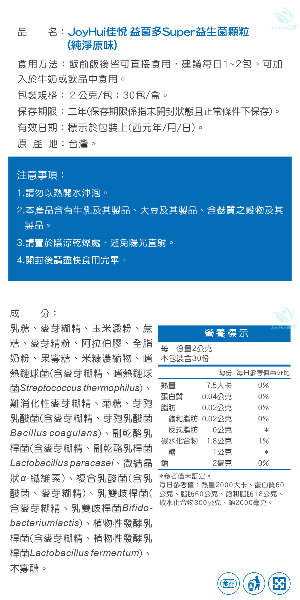 品 名:JoyHui佳悅 益菌多Super益生菌顆粒(純淨原味)